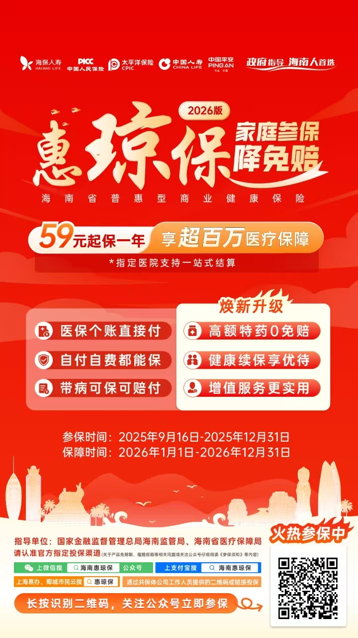 “慧琼保险”2026版项目组提醒,今年保险期限截止至2025年12月31日,保障期限为2026年1月1日至2026年12月31日。尚未购买保险的海南居民可使用微信公众号“海南慧琼保险”或支付宝、海易办、海南农商银行、云泉通、叶城。敏云。此外,您还可以接受13家互助保险公司专业人员的保险咨询和投保。
